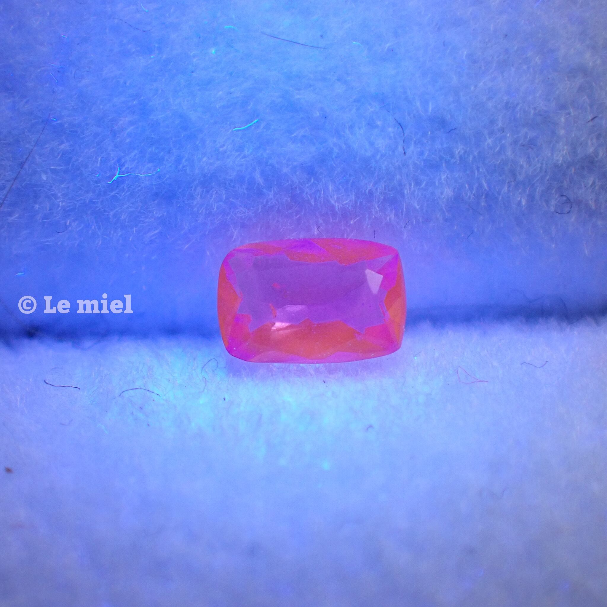 このハックマナイトは、ブラックライトを当てると薄紫から濃いめの紫に色が変わり、徐々に元の色に戻ります。写真で色の変化具合をご確認ください。