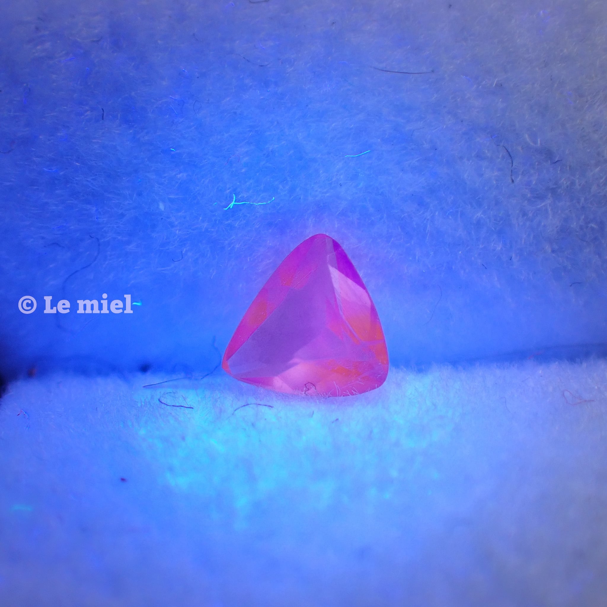 このハックマナイトは、ブラックライトを当てると薄紫から濃いめの紫に色が変わり、徐々に元の色に戻ります。写真で色の変化具合をご確認ください。
