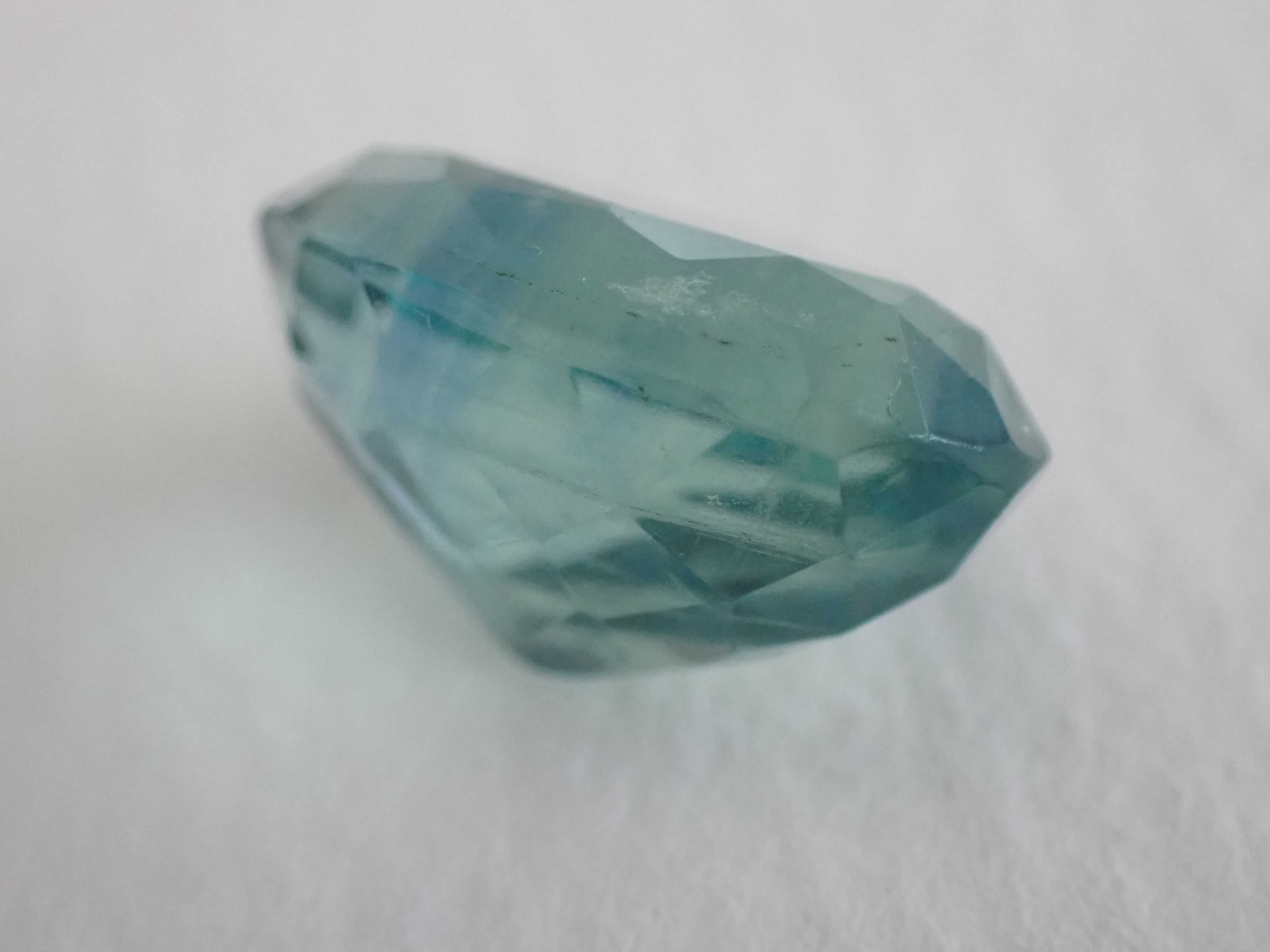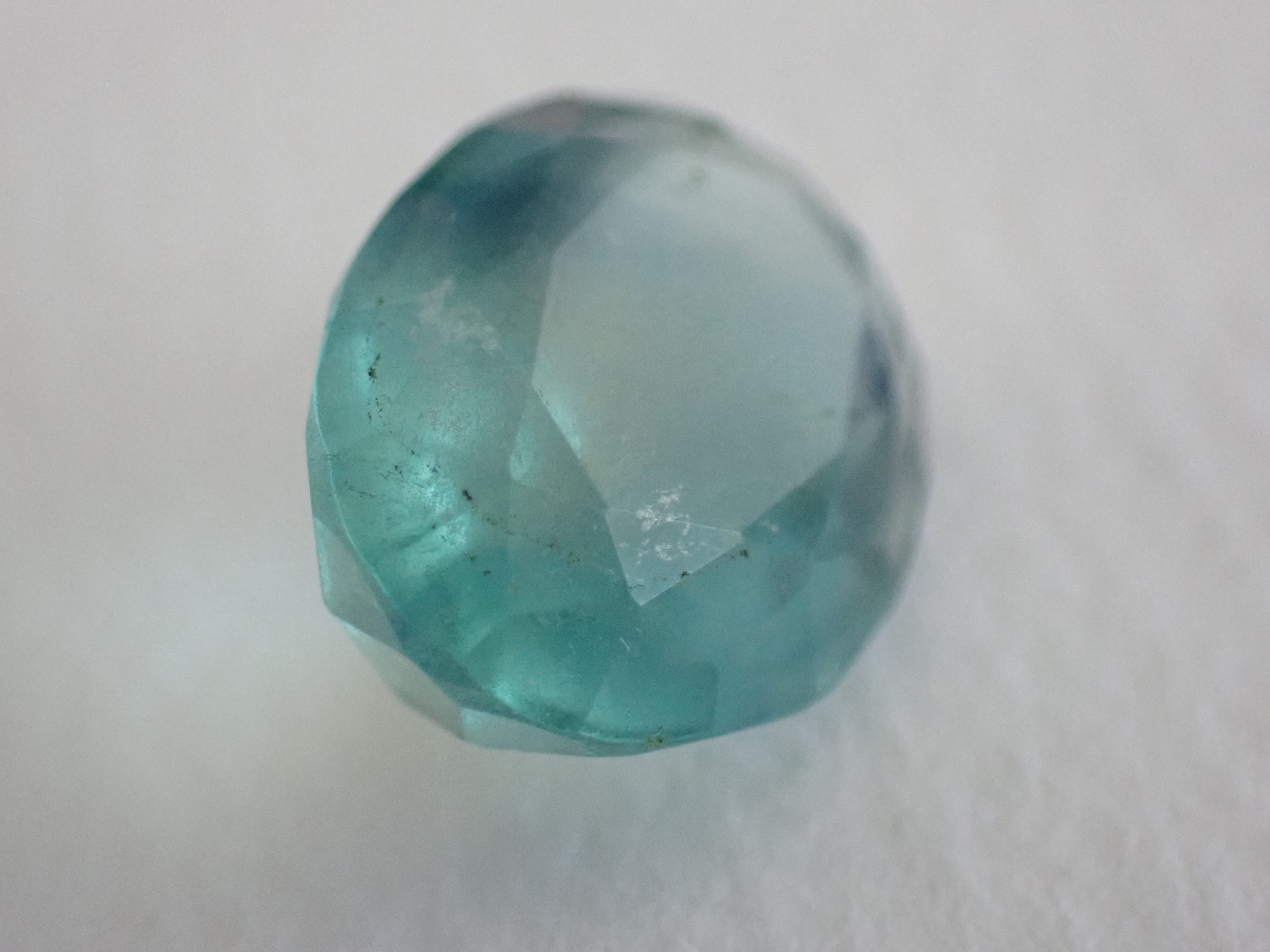 単色ではなく、バイカラーのフローライトをカットしているため、見る角度によって様々な色が見られます。
