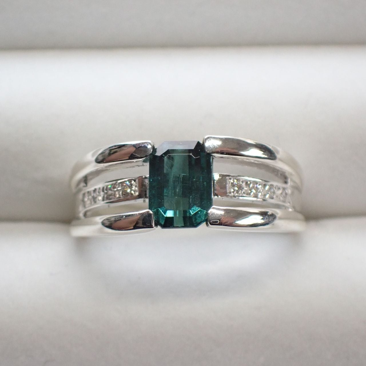 インディゴライトトルマリンの深いお色味が美しく映えるように爪以外の部分が開いており光を取込み、青が輝くリングです。立体的でトルマリンを引き立てるデザインとなっています。