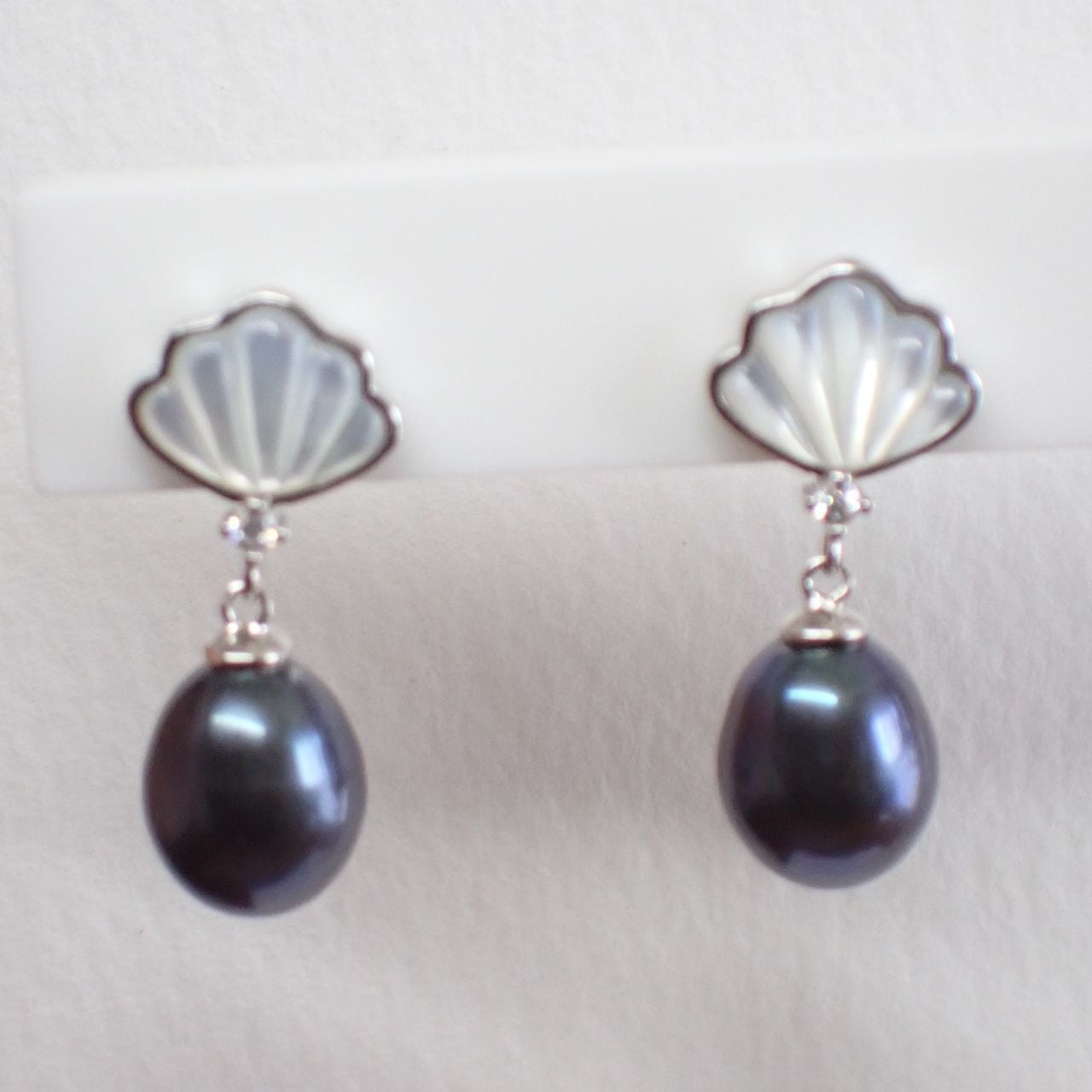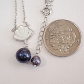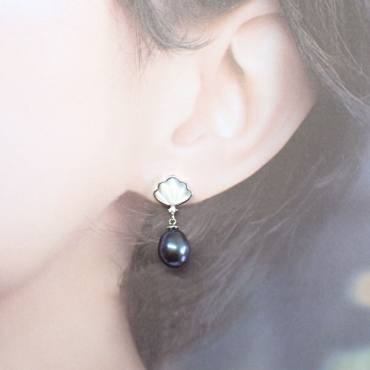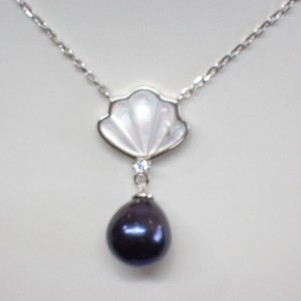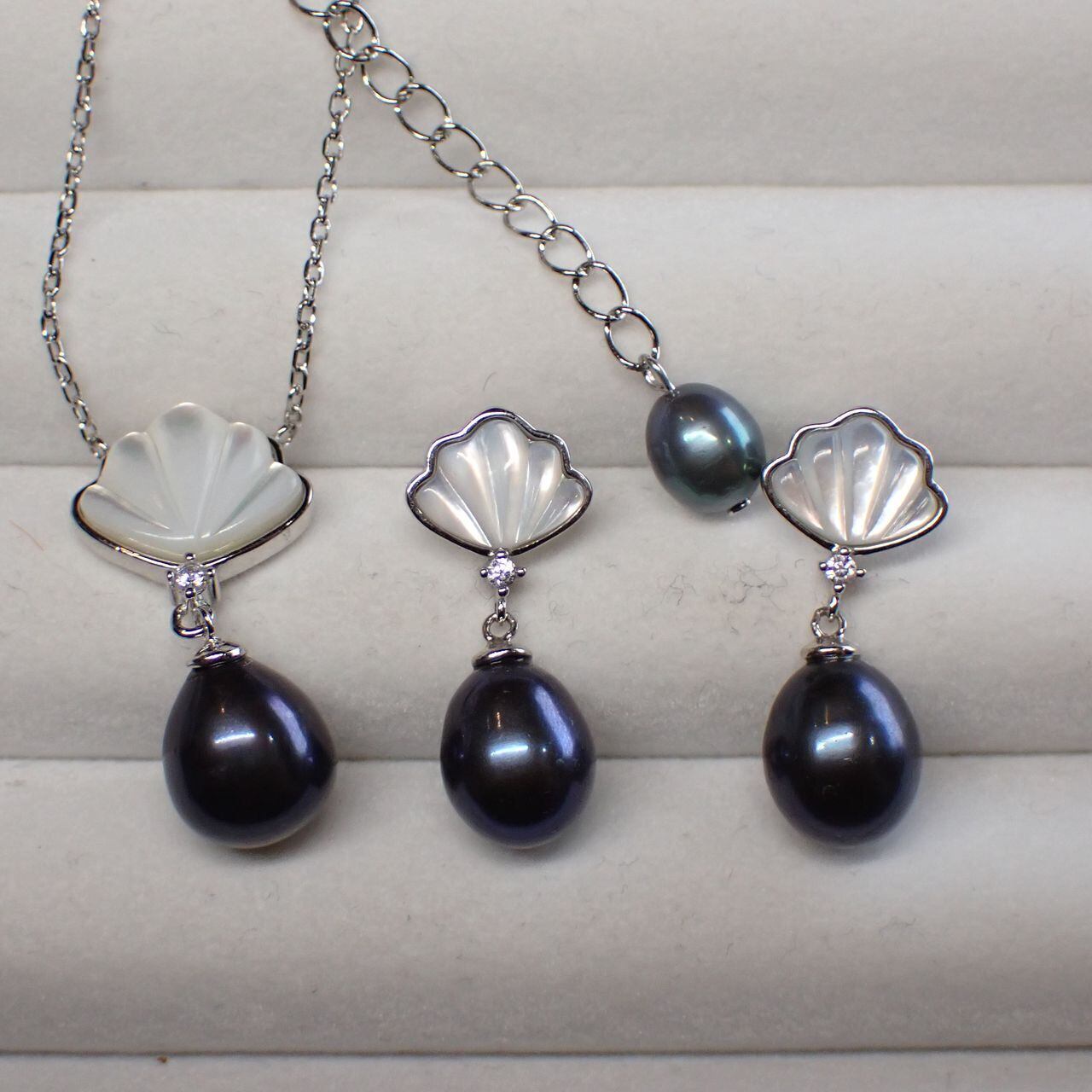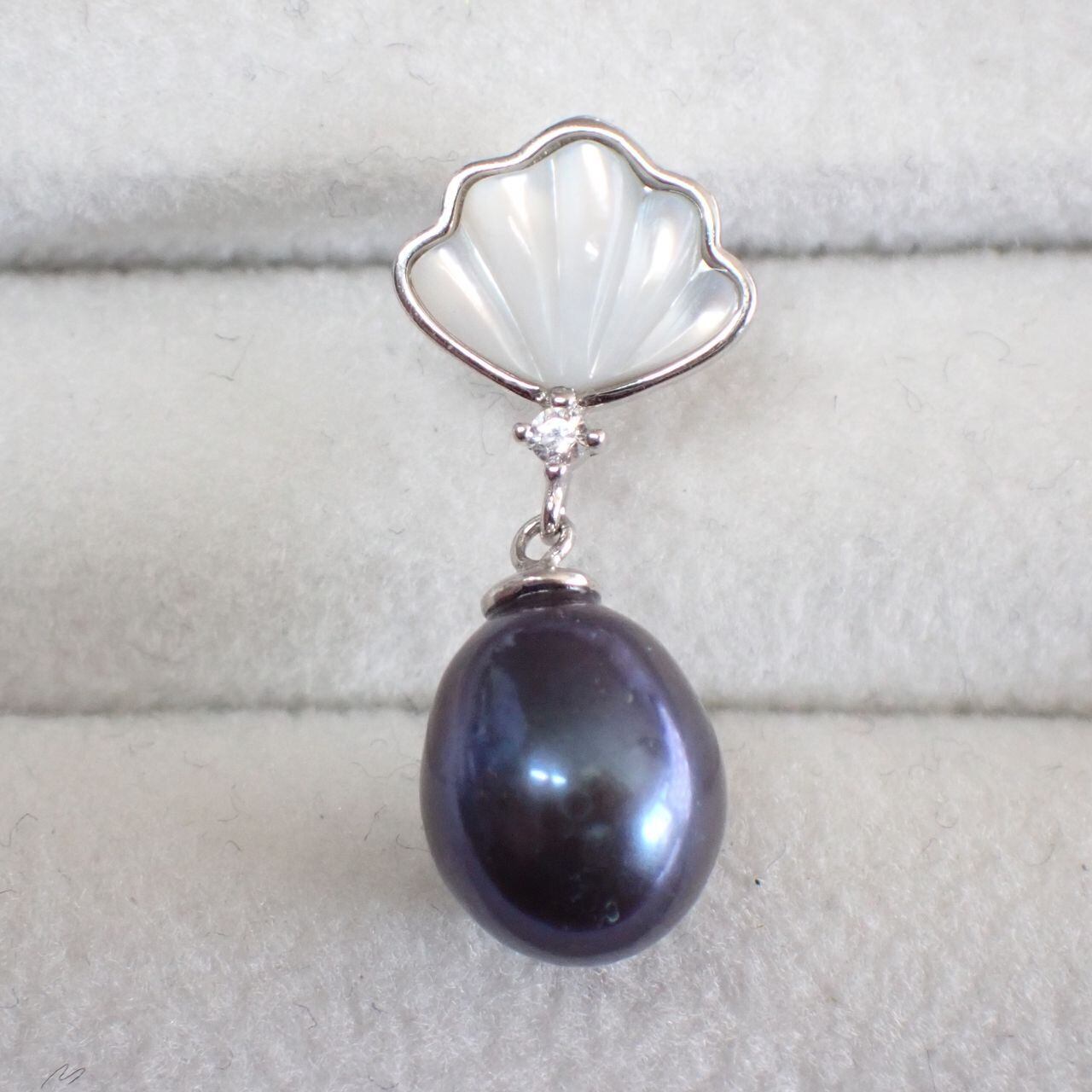 ペンダントは10x9mm、ピアスは9x8mmの大粒淡水パールと、マザーオブパールのシェルモチーフが女性らしい組合せです。