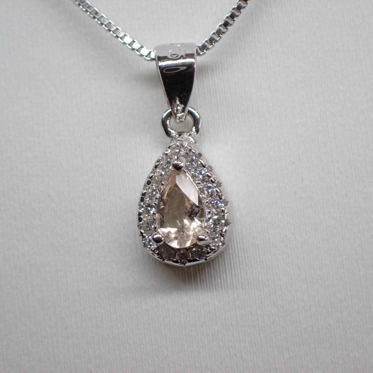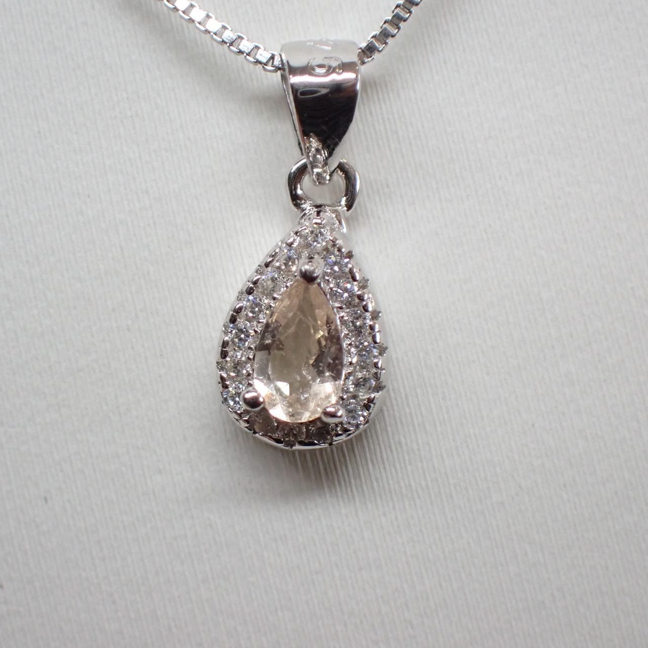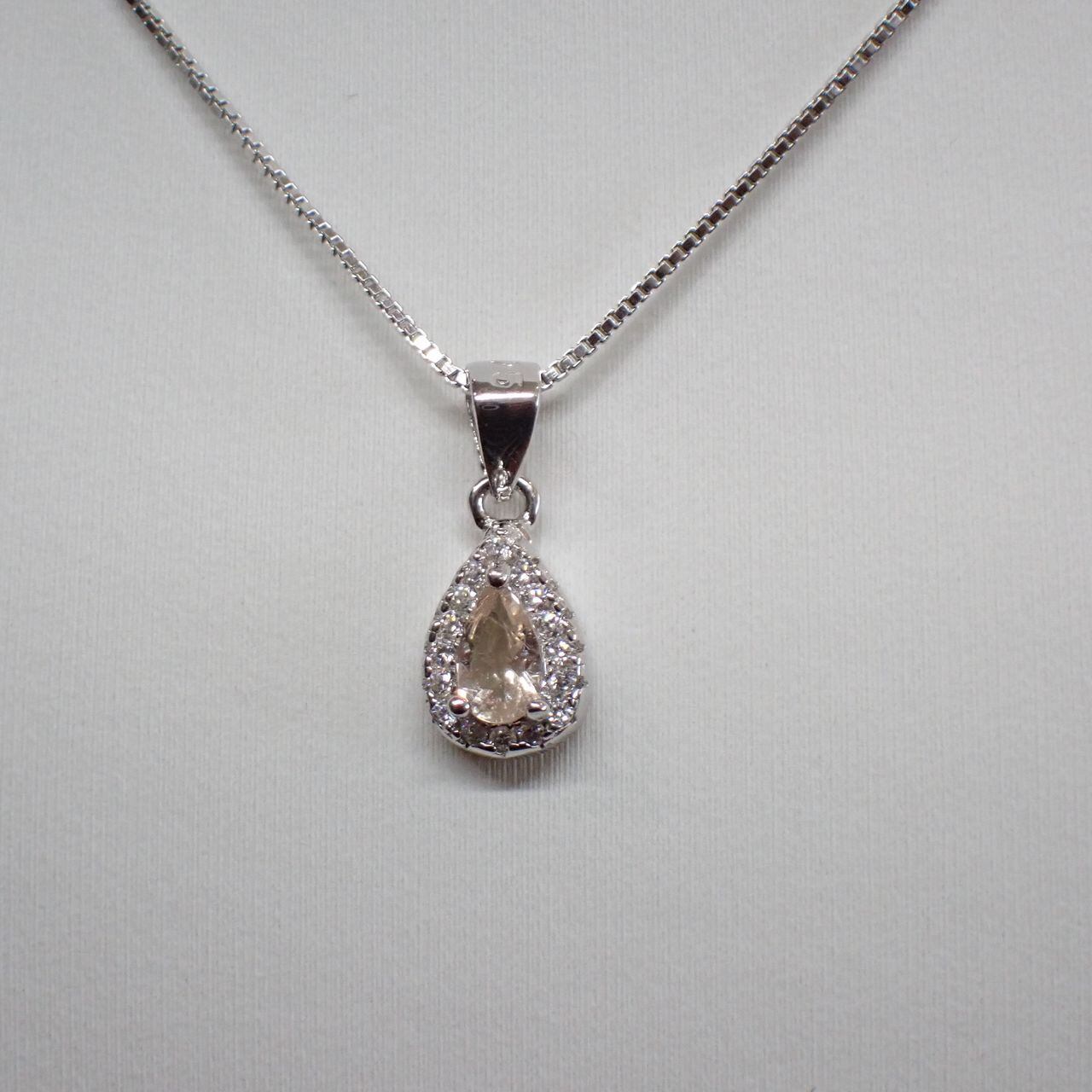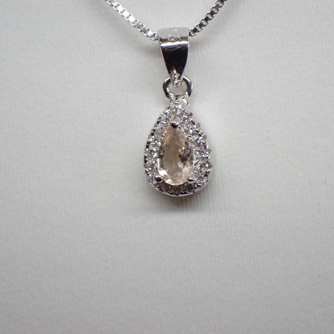 5x3mmのモルガナイトをキュービックジルコニア(cz)で取り囲んだ可愛らしいペンダントです。