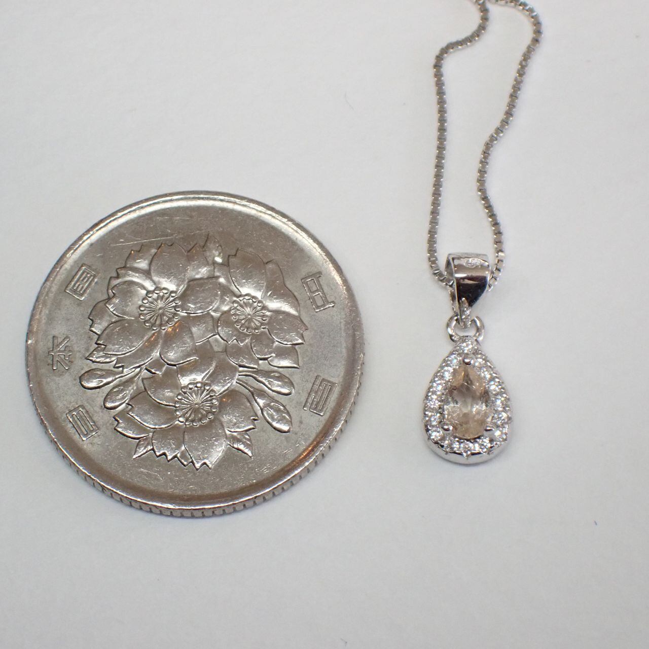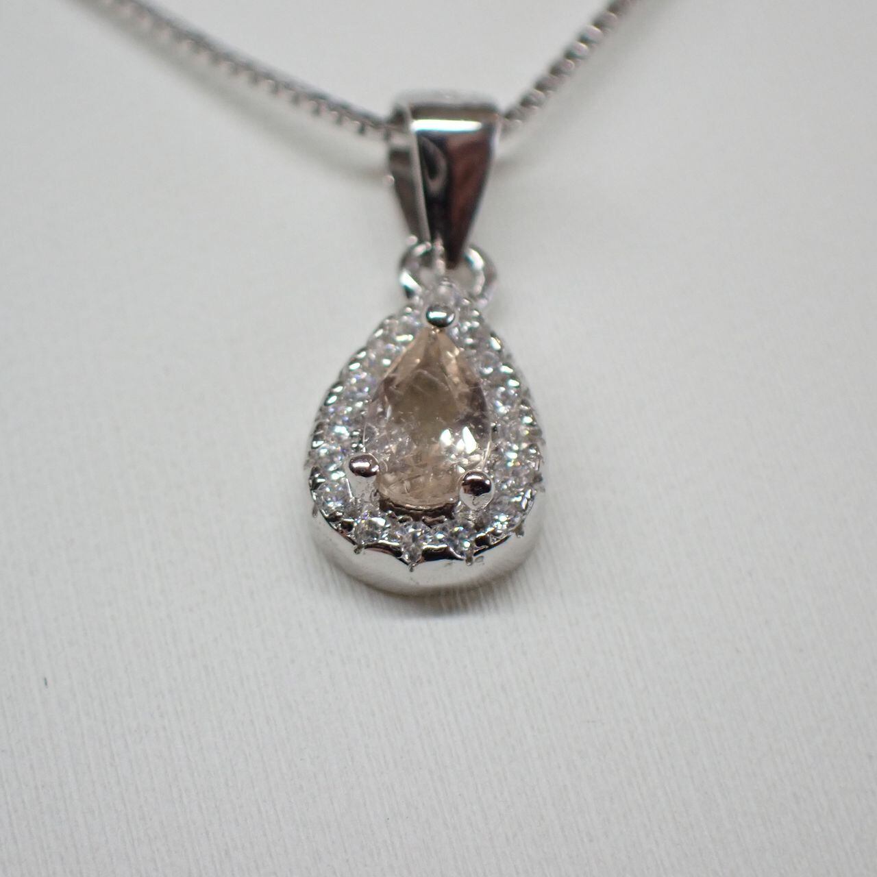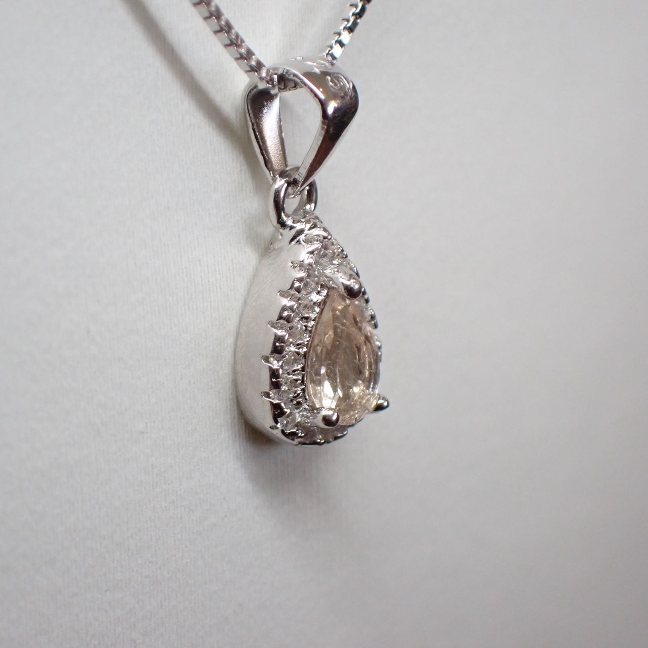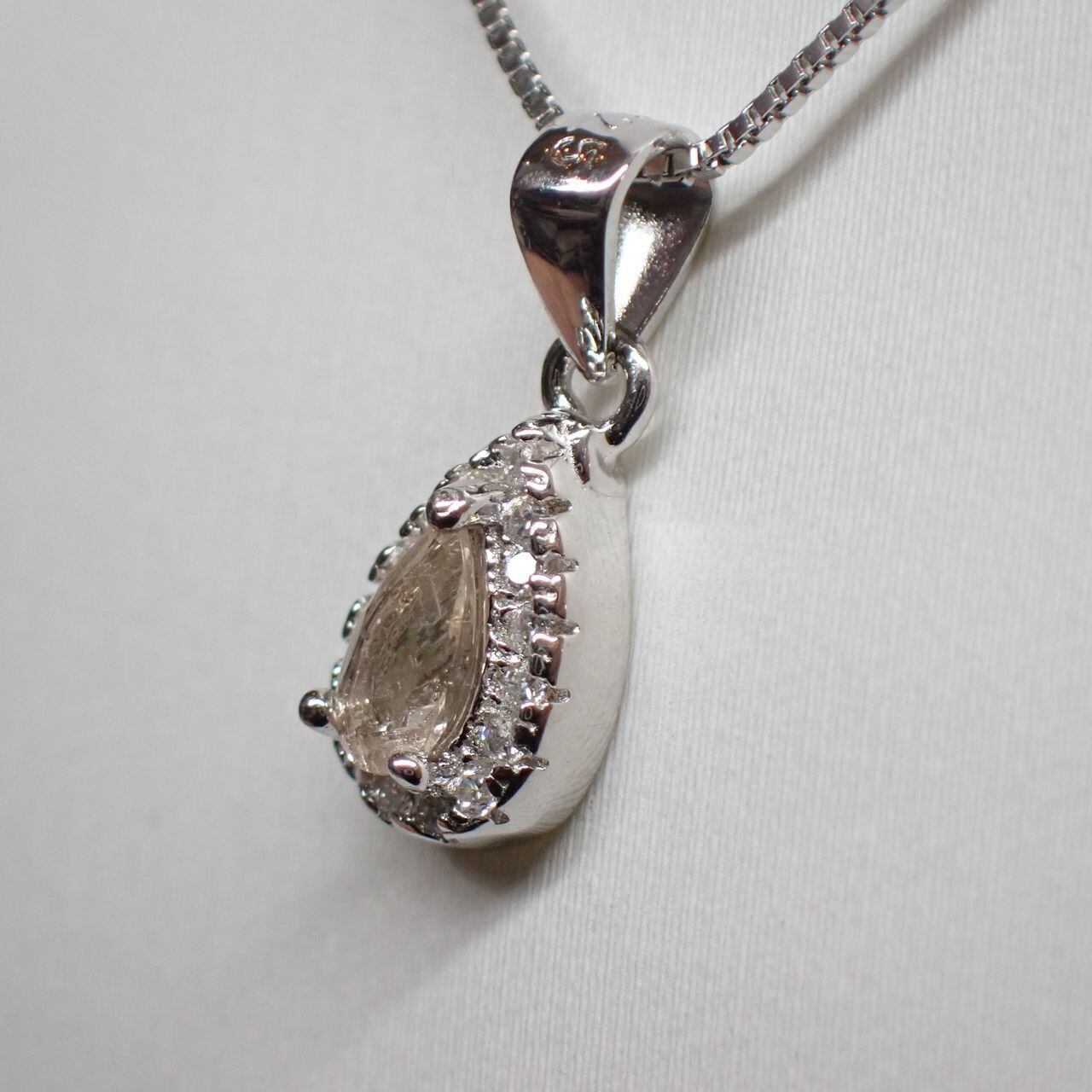 5x3mmのモルガナイトをキュービックジルコニア(cz)で取り囲んだ可愛らしいペンダントです。