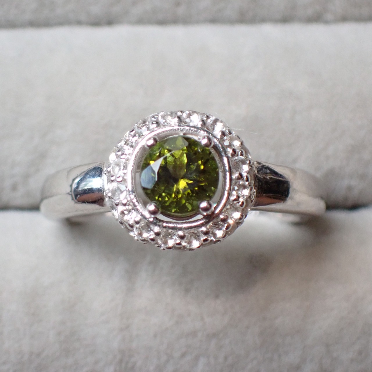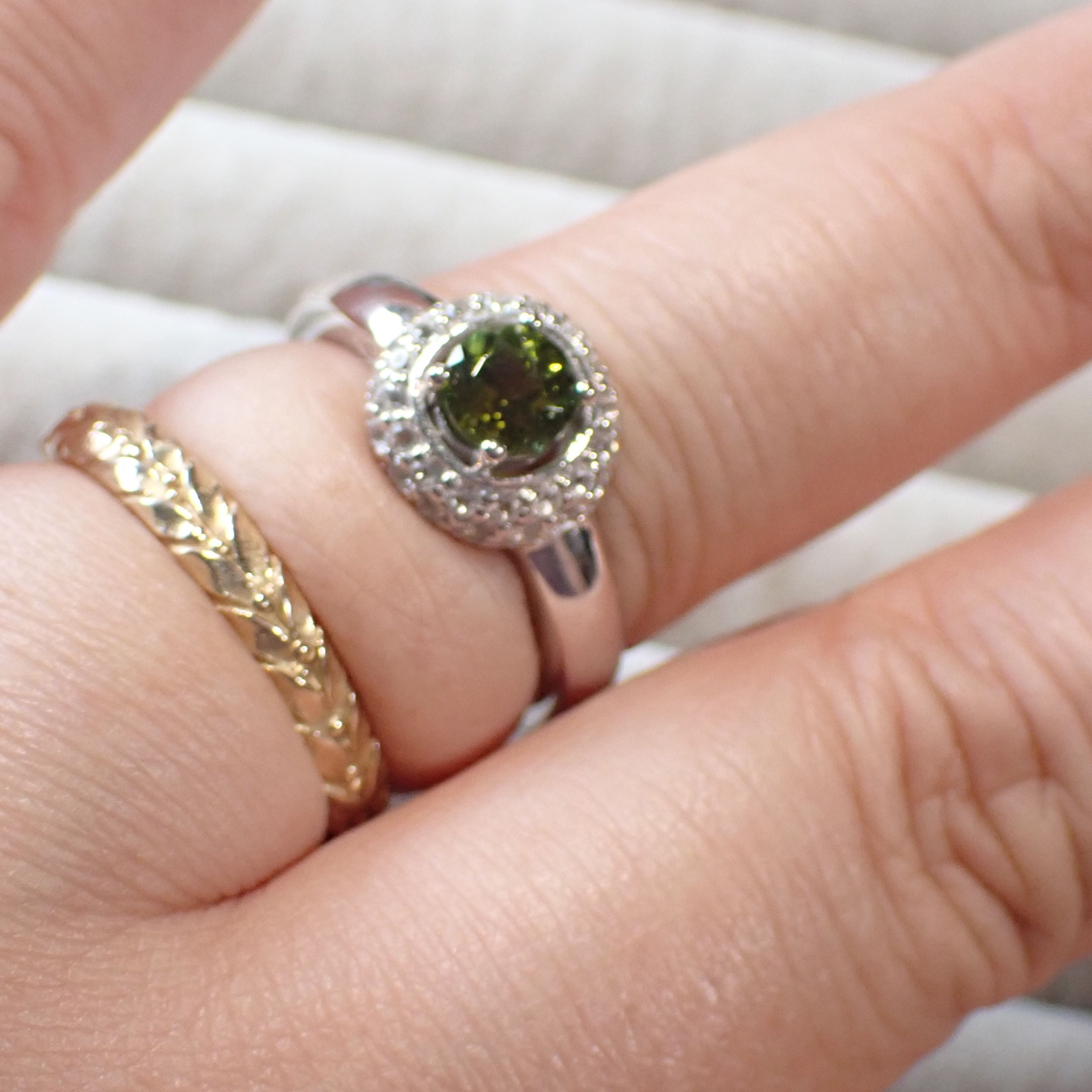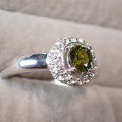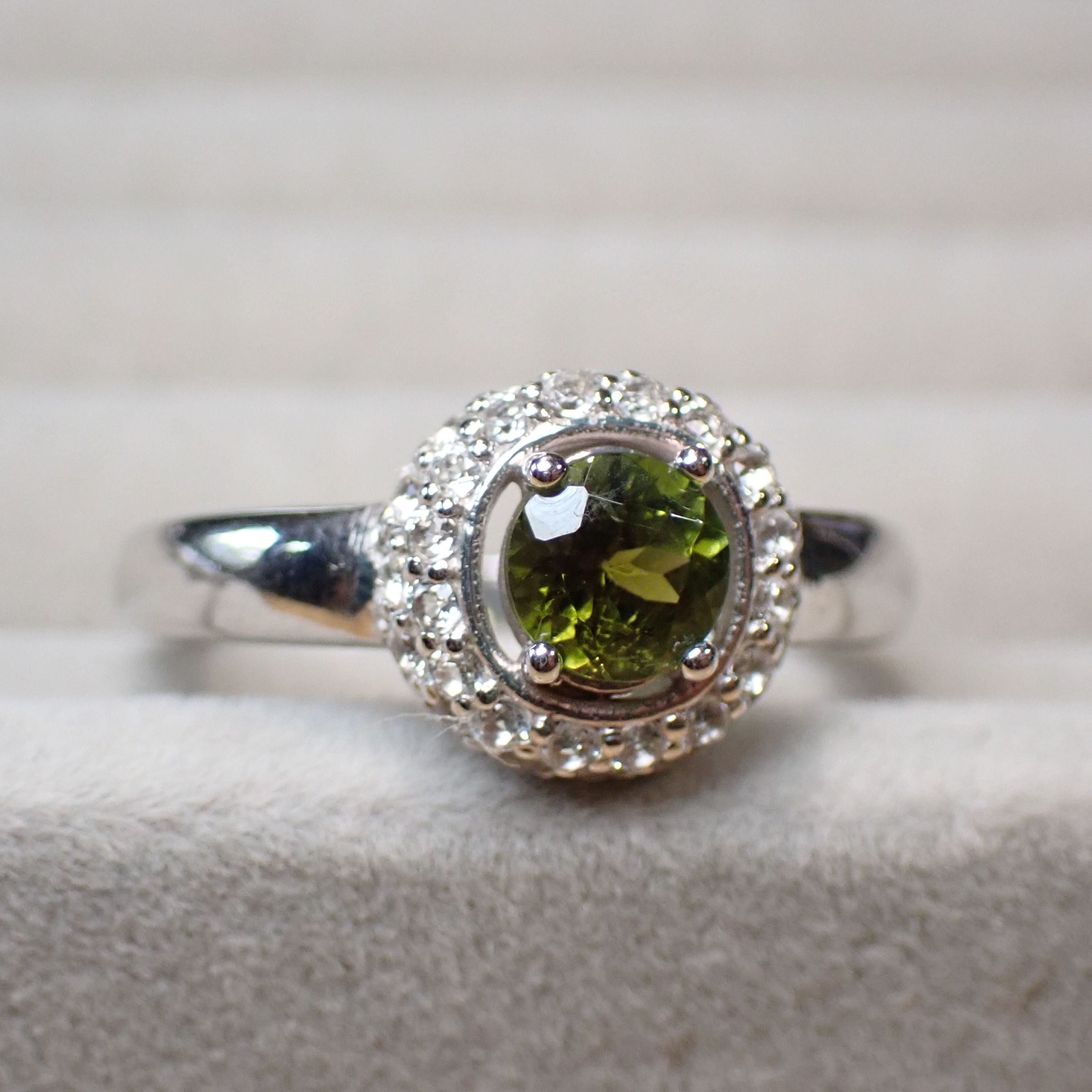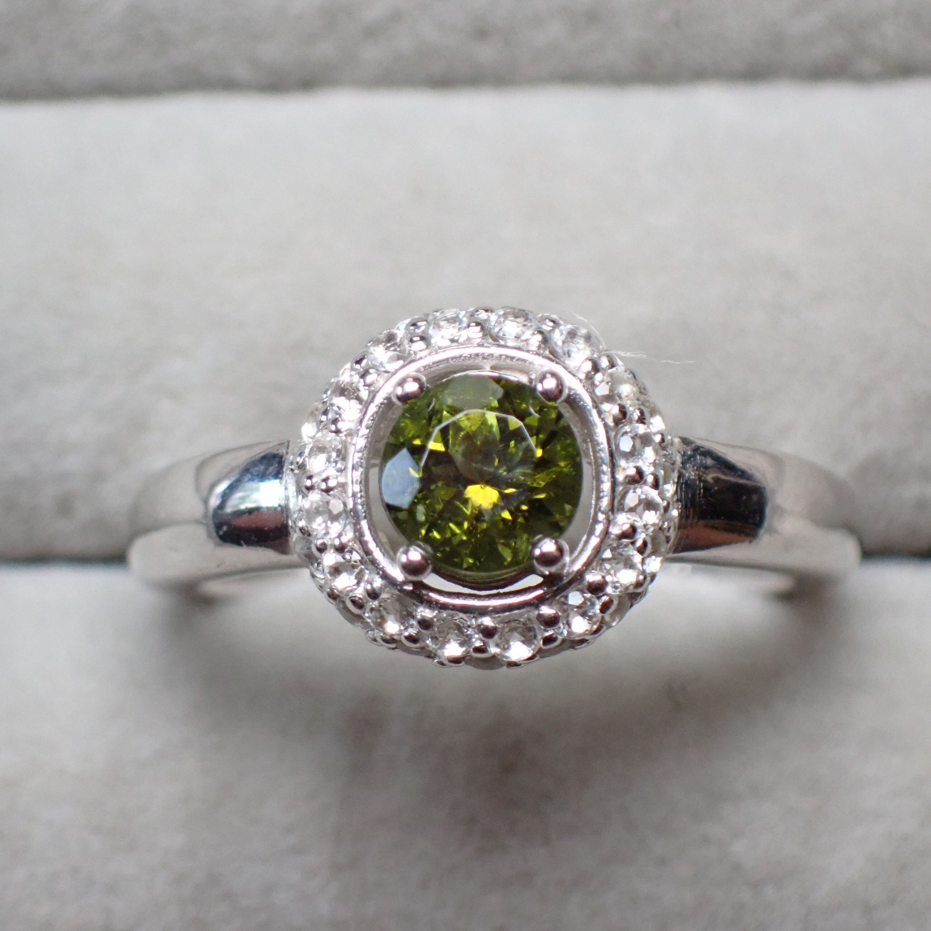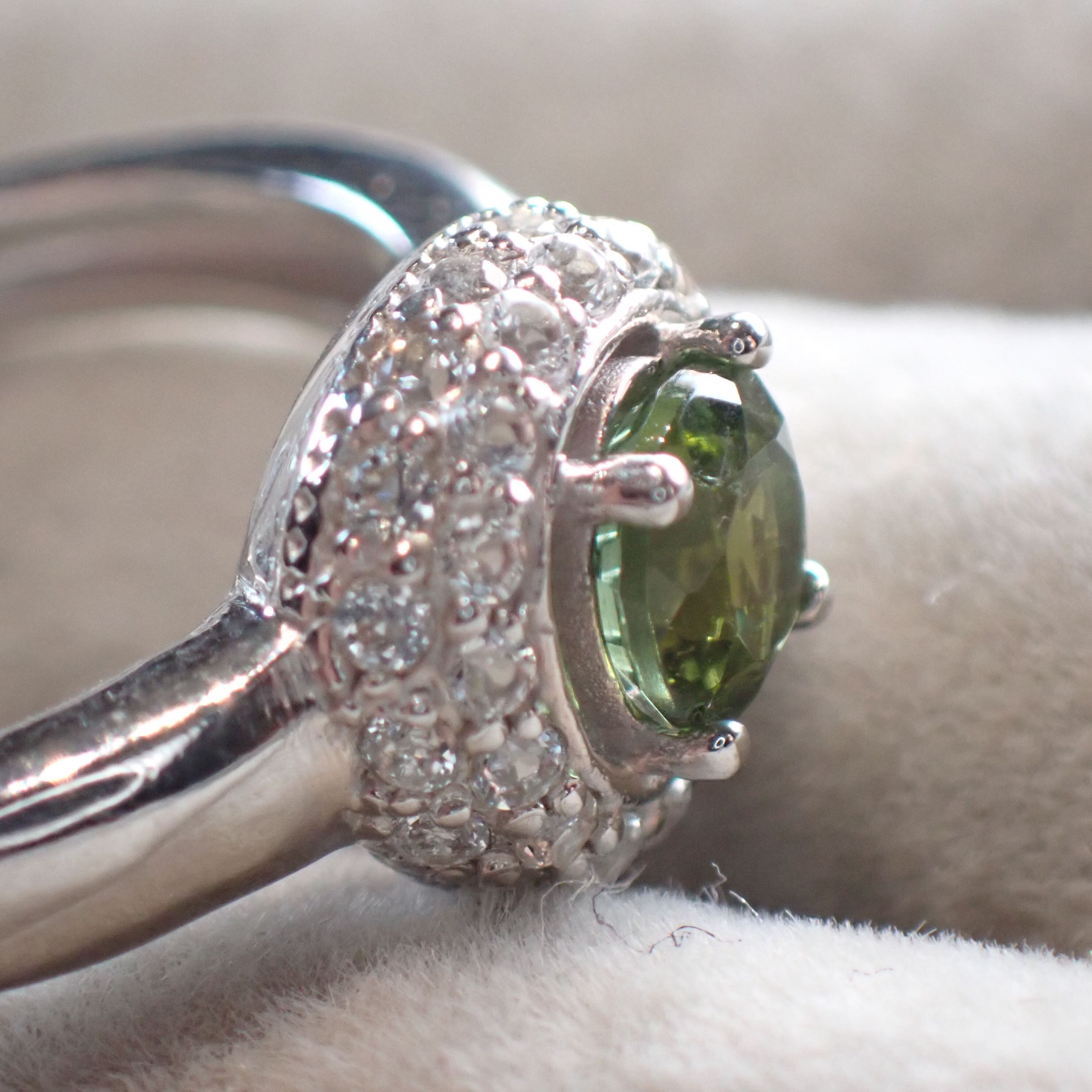 5.5mmのラウンドカットトルマリン、フォレストグリーンを引き立てるのはホワイトトパーズのメレ二重の取り巻きです。