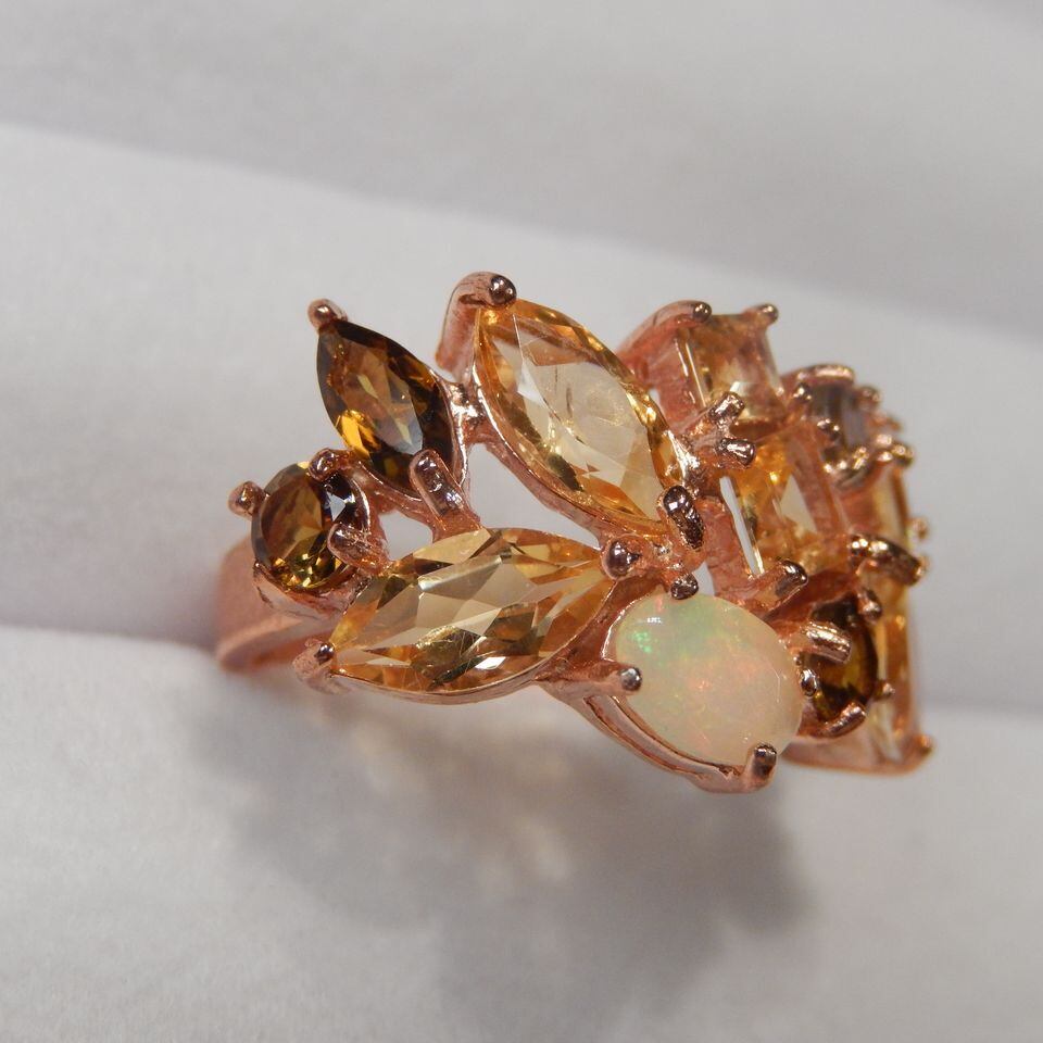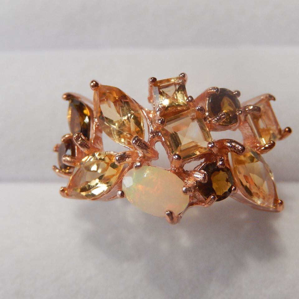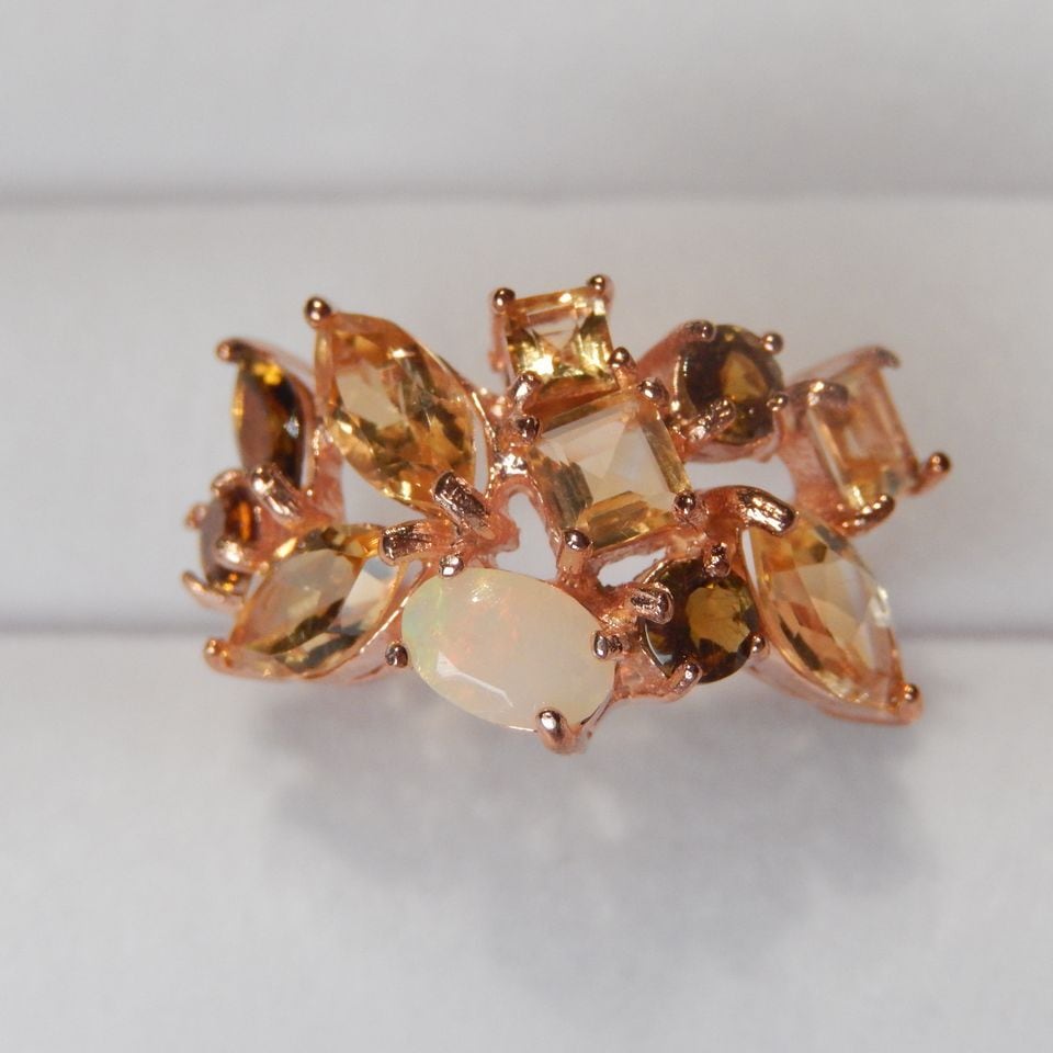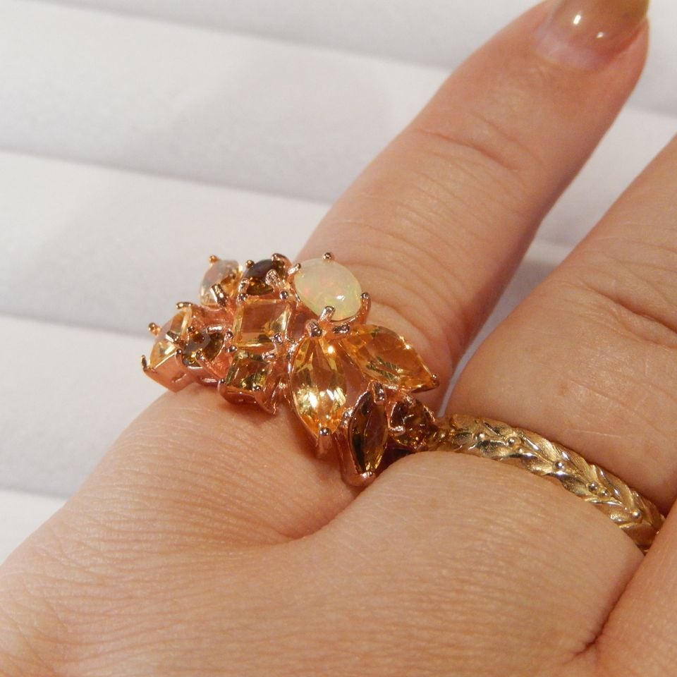 8x4mmのオパールを中心に黄色・ゴールドカラーの石を組み合わせたリングです。
