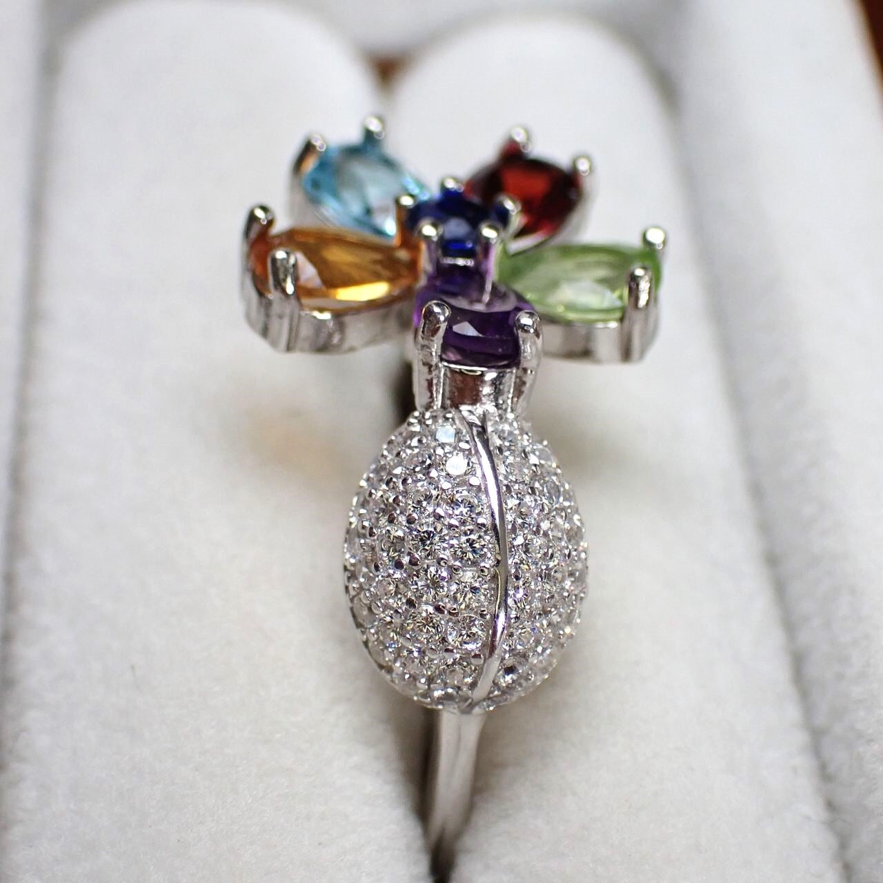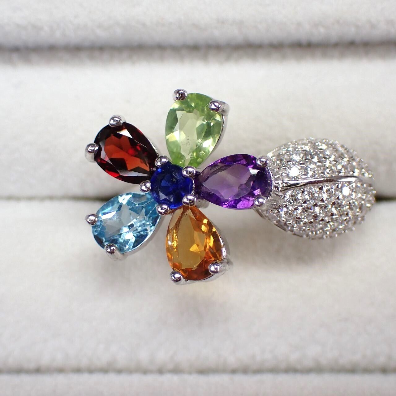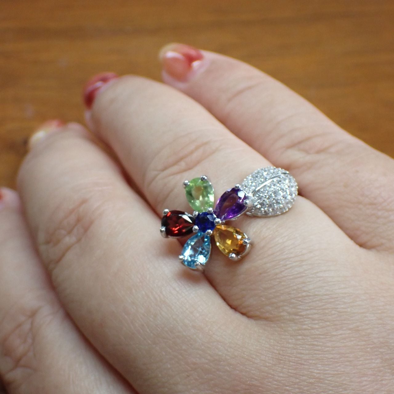 6x4mmの色石でできたカラフルなお花が指を華やかにしてくれるリングです。